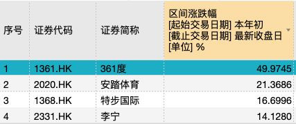 数据显示,今年以来,安踏、特步、361度、李宁等公司股价都有不小的涨幅。其中361度的涨幅更是接近50%。