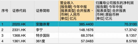 Wind显示,在营收方面,上半年安踏收入385亿元,是李宁、特步、361度总和的约1.4倍;净利润方面,安踏更是一骑绝尘,达到70亿元,是李宁、特步、361度总和的超2倍。